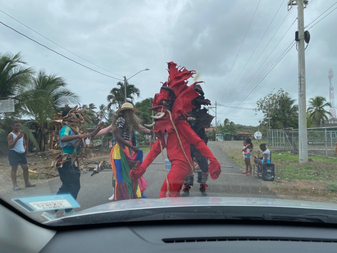 On the Caribbean side, people sometimes put on costumes and dance on the road for spare change; I saw this mainly east of Colón on the road from Sabanitas to Cuango. It can be women in colorful, elaborate dresses, or young men in drag, or in demon costumes. In some cases little kids get involved, too, and they may bring chairs or milk crates onto the road and sit in them to keep cars from getting by. A little spare change opens the street right up; if you really don’t want to pay, you can slowly roll through and no one’s going to key your car or anything, but a better play is to take a picture and give them a buck or two for their trouble. They’re trying to entertain you, not rob you, so be nice.