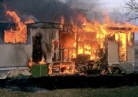 •They also burn. In the tiny town where I live now, we seem to have at least one mobile home fire every year, and when they burn, they burn down to the steel chassis. Despite leaking like sieves, mobile homes are full of fire hazards, owing mainly to three issues — the wood paneling that covers every wall and is inside the ceiling, the generous use of plastic sheeting in the construction process, and substandard electrical work. First, the paneling: if you’ve never burned it before, try it sometime. Wood paneling is made from sheets of thin veneer, coated in glue and pressed together, similar to plywood, then given a treatment on one side that might be just a coat of varnish, or a faux woodgrain pattern painted on or applied in the form of something like a giant decal. Regardless of the exact process, what you end up with is a product where the wood is the least flammable ingredient. Next, the plastic sheeting: because they were cheap, mobile home manufacturers used plastic sheeting in a lot of places where it simply doesn’t belong, and if you’re wondering what some of those places are, it’s anywhere other than on the ground, beneath the home. Plastic sheeting was often used in place of breathable moisture barriers, to create a home that not only traps water and blocks air circulation, but burns like it was doused in gasoline. I’ve found plastic sheeting in mobile home ceilings, walls, and floors. I always rip it out when I find it, but the only way to get it all is to either rebuild the entire home or light it on fire. Which brings me to the electrical systems. I won’t get too into the details, but the basics are that you have wiring that’s too thin, with too many lights and outlets on the same circuit, cheap materials that are more prone to heating up, and dangerous electrical connections. One common problem occurs in old mobile homes with aluminum wiring; aluminum expands more than copper when it gets hot, causing it to loosen connections. It’s more prone to corrosion, and when connected to copper, it corrodes even faster. Some mobile home fires are started when a new light fixture with copper wiring is connected to the old aluminum. Braided aluminum furnace wire is another issue I’ve fought with — braided wire tends to shift its position within connectors even more than solid aluminum wire. I could go on, but instead I’ll just say this: picture a mobile home where you have dried out sawdust and broken pieces of wood, plastic sheeting, and a modern light fixture with three 100W bulbs in it, where it should only have 50s, connected to the home’s original aluminum wiring, all within inches of each other. Now tell me how every old mobile home in America hasn’t burned down already.
